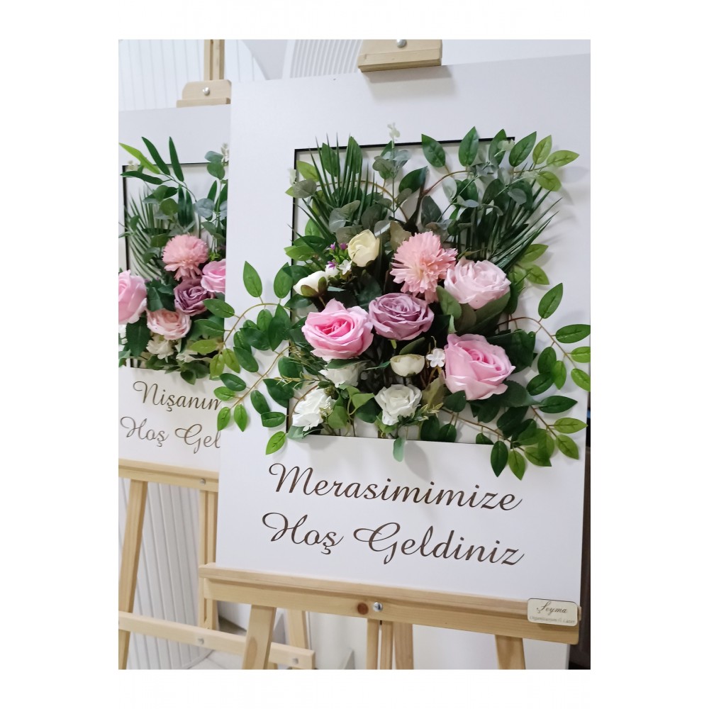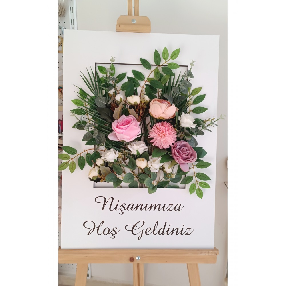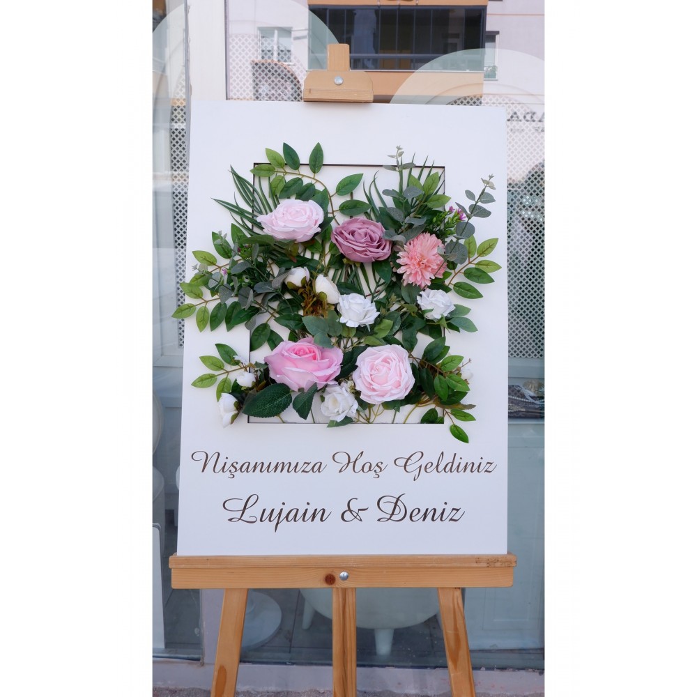 Çiçekli Ahşap Nişan Karşılama Panosu